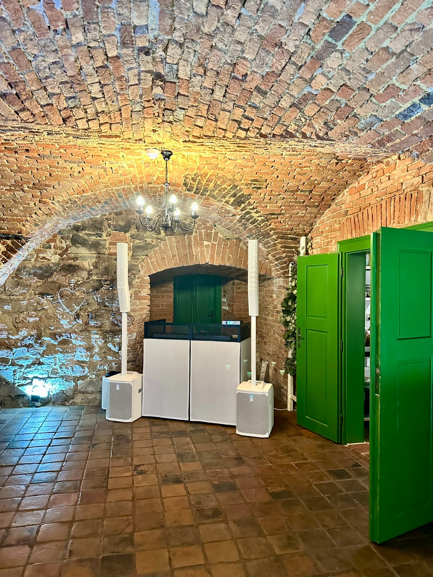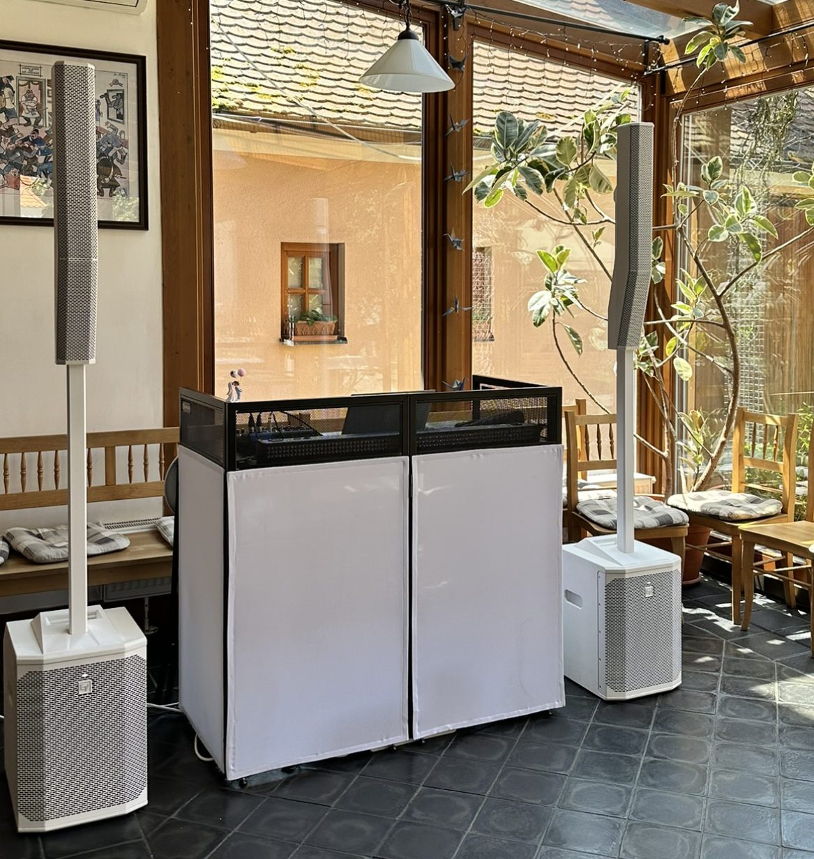 - Reproduktory: 2x Electro-Voice Evolve 50 bílé sloupové repro nebo ELX200-12P-W (bílé), mobilní reproduktor EV Everse 8 (bez potřeby elektřiny).